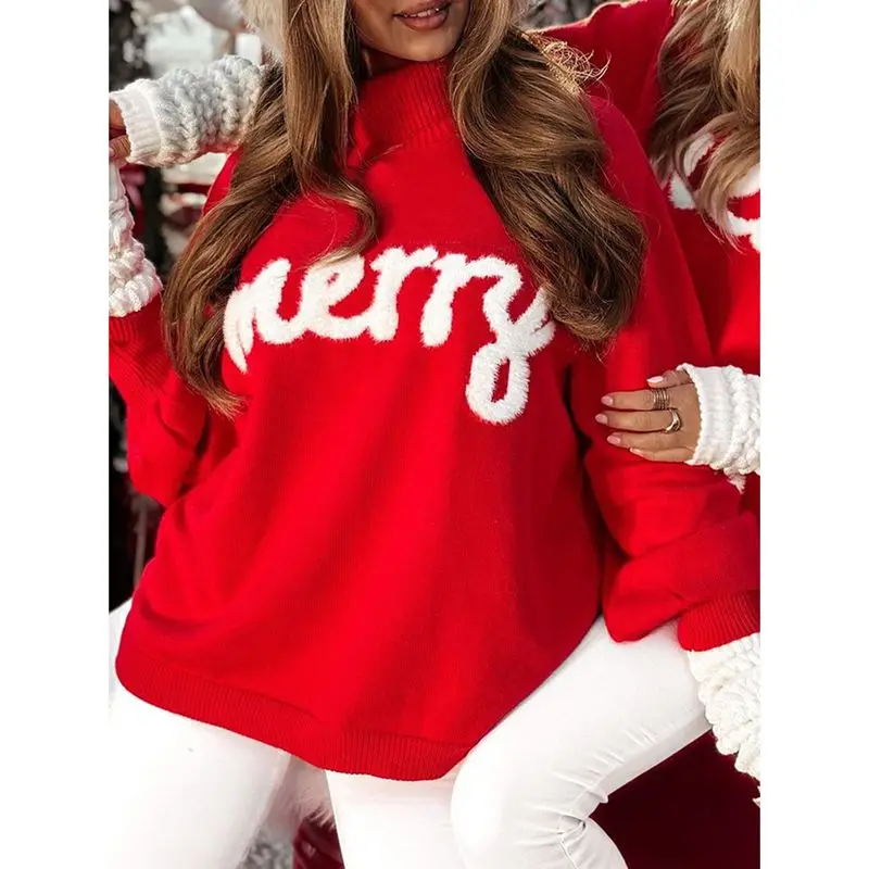 Women’s Autumn Loose Sweater Letter Embroidery Long Sleeve Turtle Neck Knitwear Pullover for Christmas