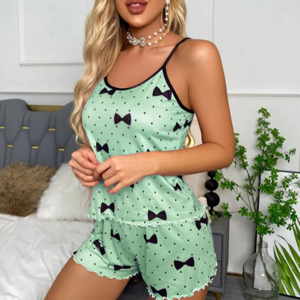 Be the first to review “Sleepwear Female Ladies Pajamas 2 PCS Set Bow Printing Soft Ribbed Fabric Ventilate Soft Trim Casual Top and Shorts Loungewear”