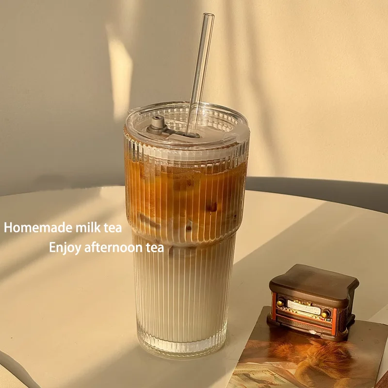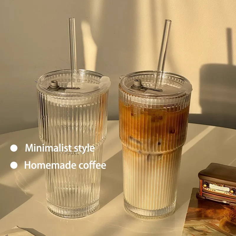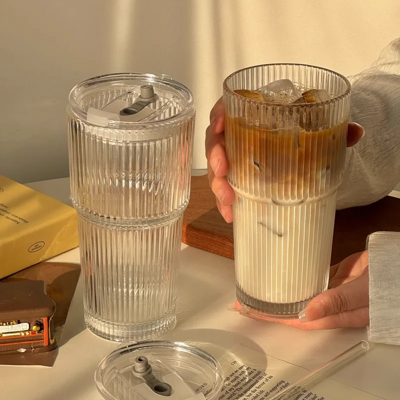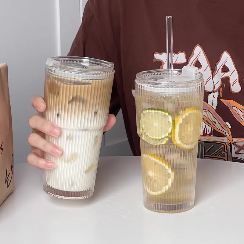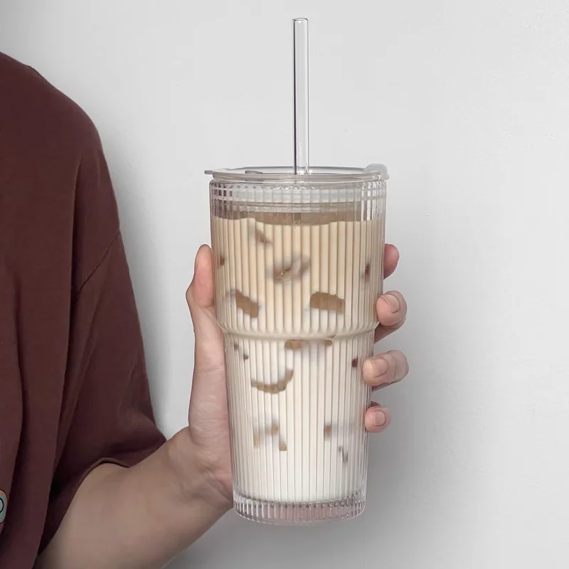 2025 large capacity with lid with straw vertical striped glass cup high-value cold drink cup coffee drink cup water cup minimali