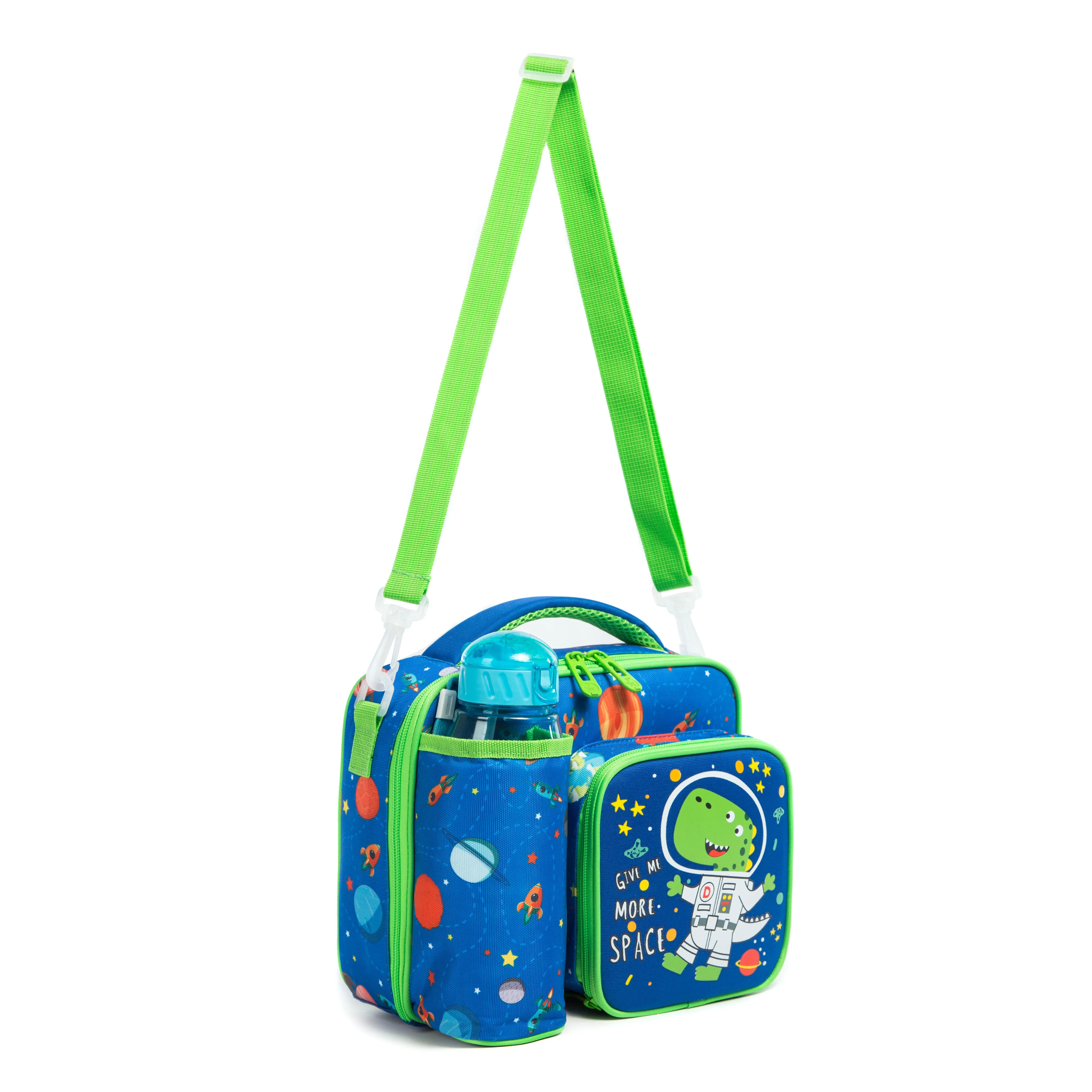 Design of the space of the bag for the boys: main bag x1, bag for water cup x1, bag for snack piccola x1.