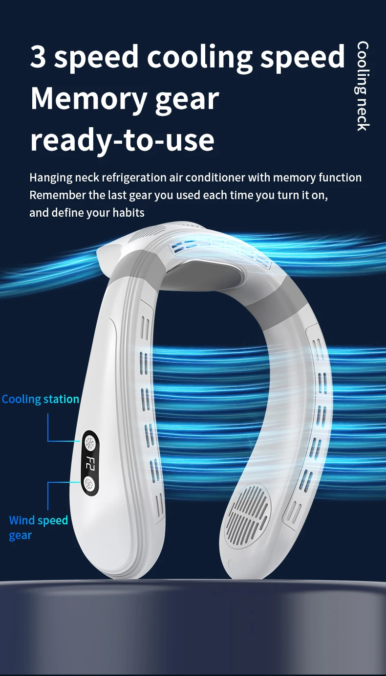 - 3-Speed Refrigeration Air Speed, Memory Gear Function, Turn On Again That Is Used – Neck Cooling Air Conditioner With Memory Function, The Experience Is Upgraded Again Each Time You Turn On The Power To Remember The Last Use Of The Gear, Defining Your Habits