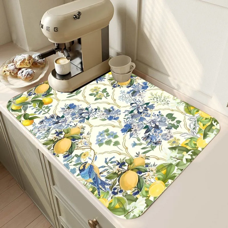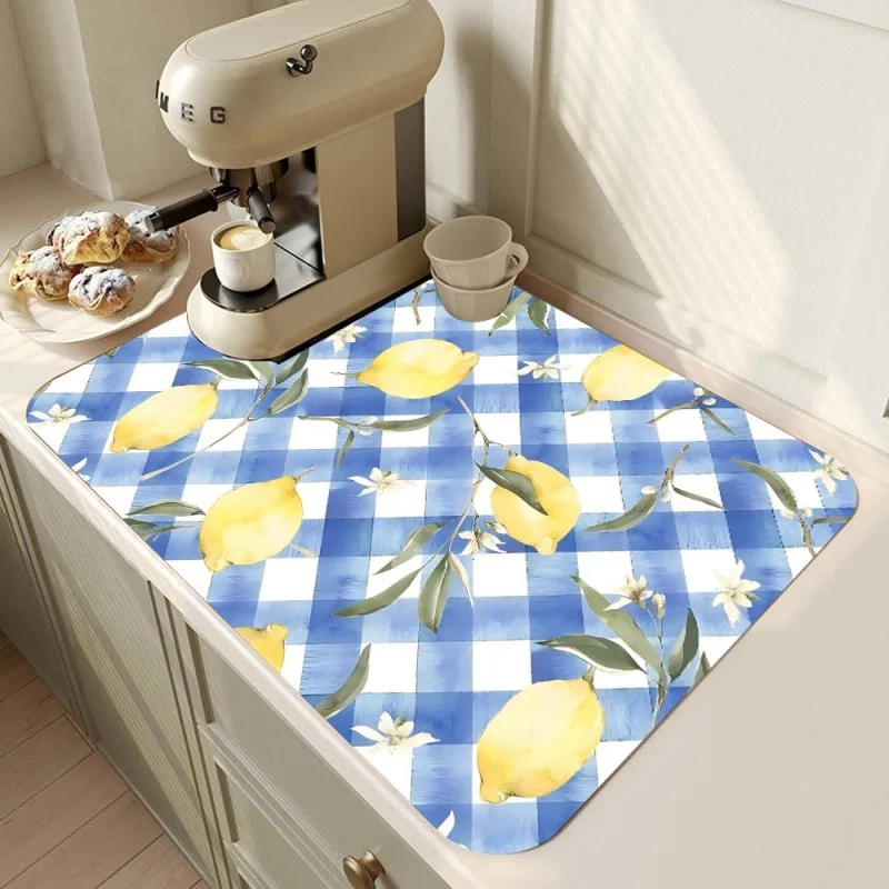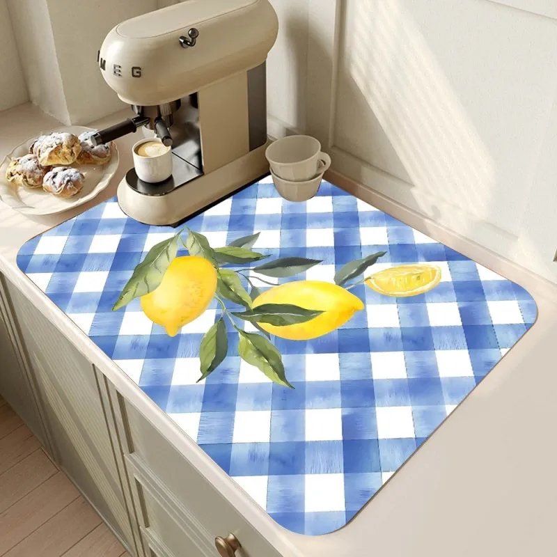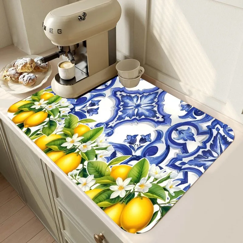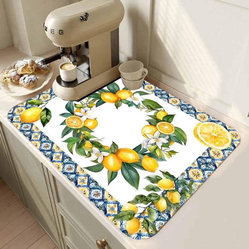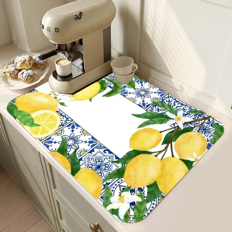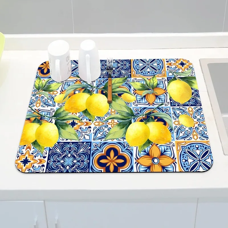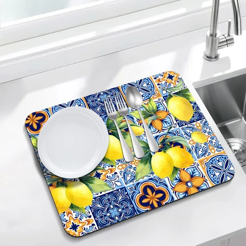 Rubber Dish Drying Mat for Kitchen Counter Large Lemon Washable Quick Home Coffee Pad Fit Under Sink,Bar,Utensils